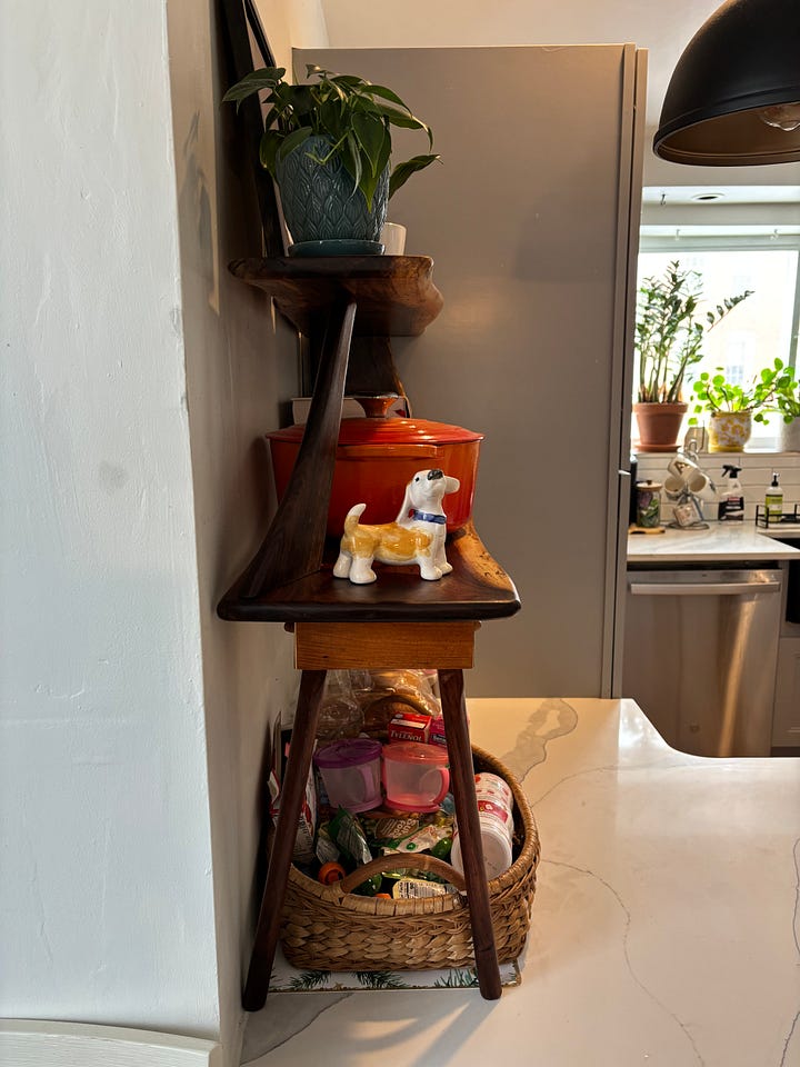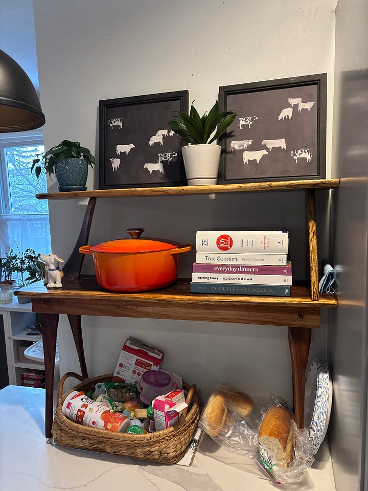 The shelves are up now. Walnut from the yard, holding a Le Creuset and a stack of cookbooks over my daughter’s snack basket. Anna loves them. Not because of the brass pins or the bowtie or the hand-shaped legs. She loves them because they hold stuff and they look good in the corner. And because I love them.